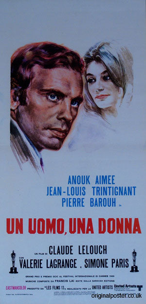 Winner of the Best Foreign Film Oscar and the Palm D'Or at Cannes this wonderfully romantic film was directed by Claude Lelouch. This great Italian film poster is a wonderful tribute with subtle artwork of Anouk Aimee and Jean-Louis Trintignant. The poster was printed in Italy by Rotolitografica - Roma. One horizontal fold line together with some faint crease lines.