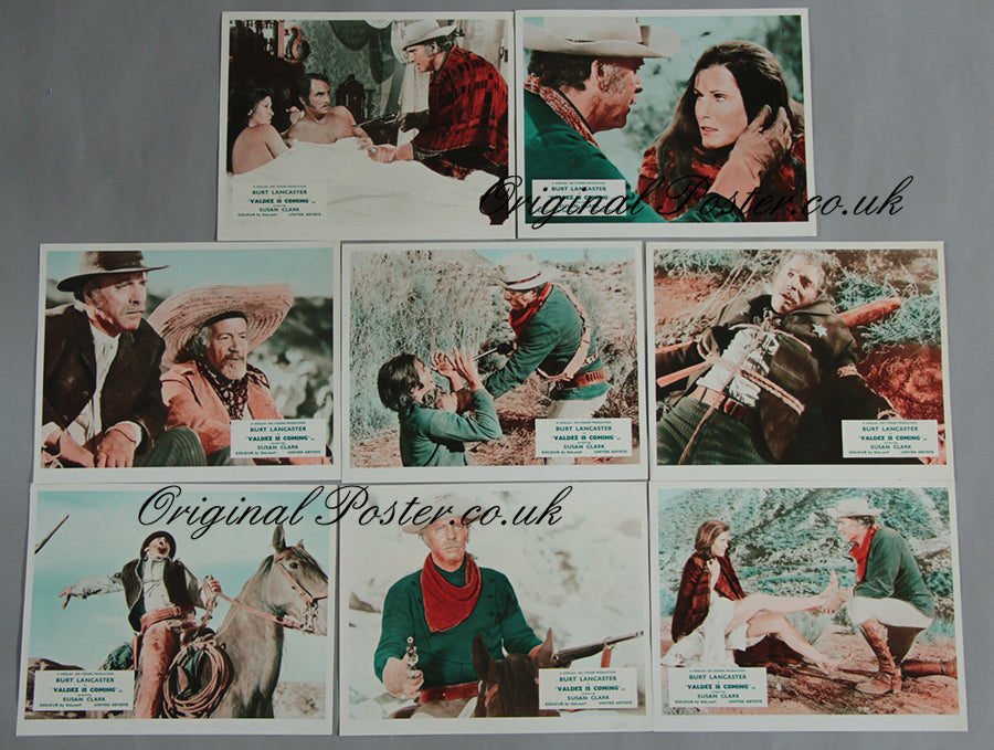 First release 1971 full set of colour front of house cinema lobby cards for "Valdez is Coming". The impressive Burt Lancaster is pictured as the Mexican-American law man hell bent on justice. Excellent condition, no pinholes.