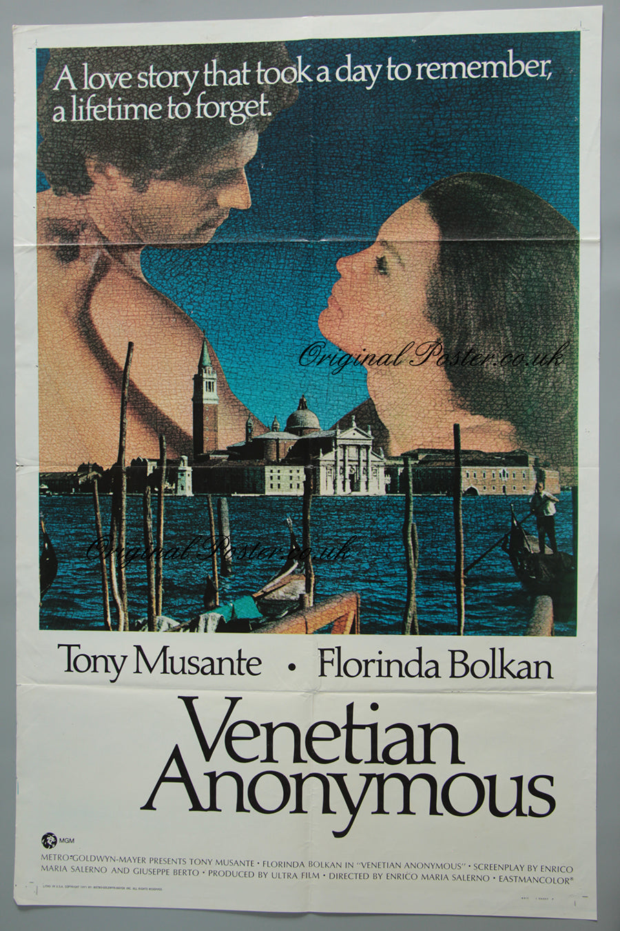 This litho printed 1971 Metro Goldwyn Mayer film poster has a mosaic style painting of Venice and the gondolas with the lovers behind Saint Mark's Square. Folded condition as issued to the cinema with pinholes in the borders.