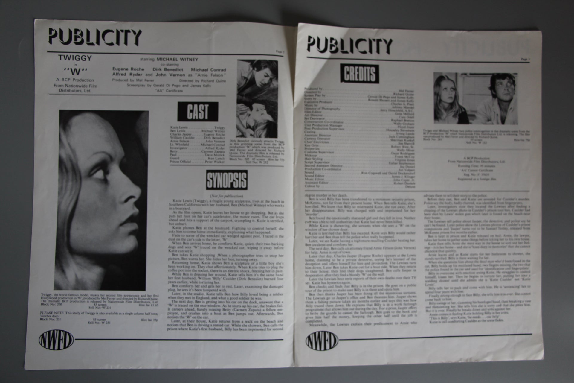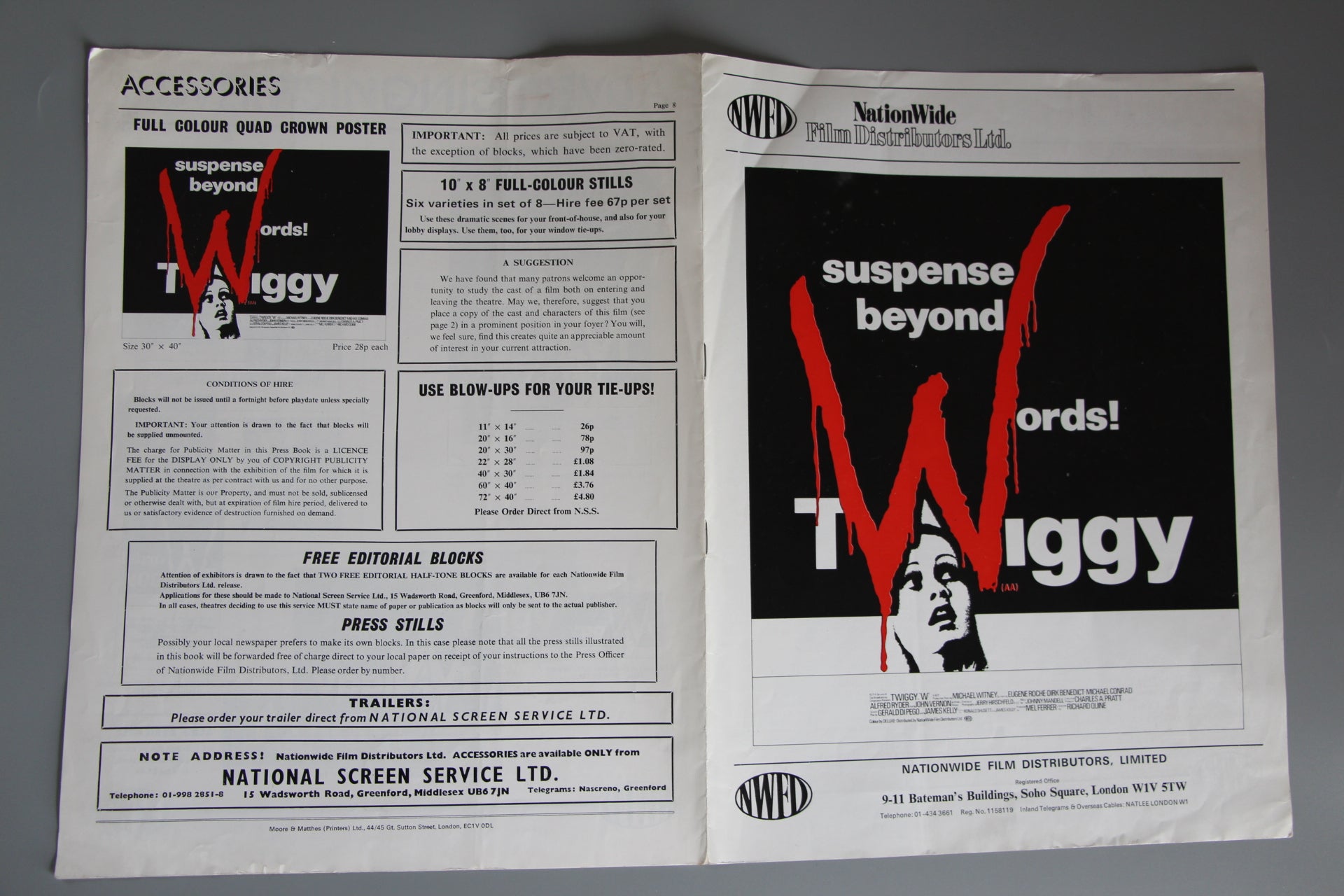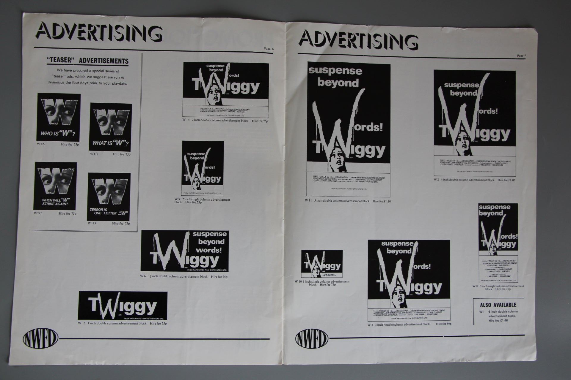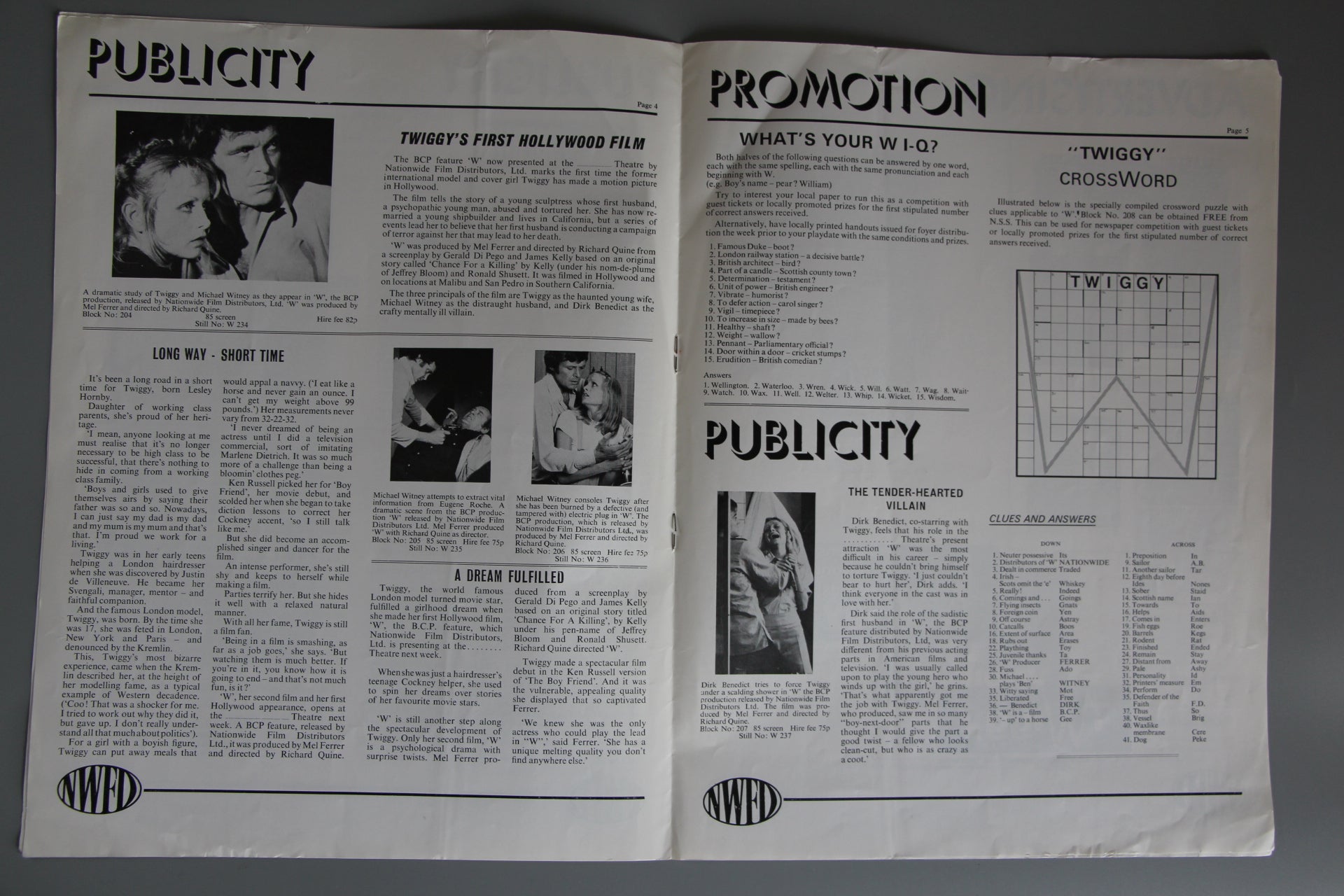 8-page cinema publicity campaign booklet featuring great photos of the beautiful Twiggy as issued to cinema owners to promote her second film. The publication includes interesting facts about Twiggy and her rise to fame together with promotion ideas and publicity for the film including ad blocks, front of house details and details of the quad crown film poster.