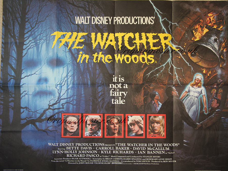 This Walt Disney British quad film poster for "The Watcher in the Woods" marks a rare departure for Disney into the genre of supernatural horror complete with an 'A' certificate. The ending of the film was changed following a test screening but despite starring Bette Davis as the sinister cottage owner was not altogether successful. Printed in England by W. E. Berry Ltd.
