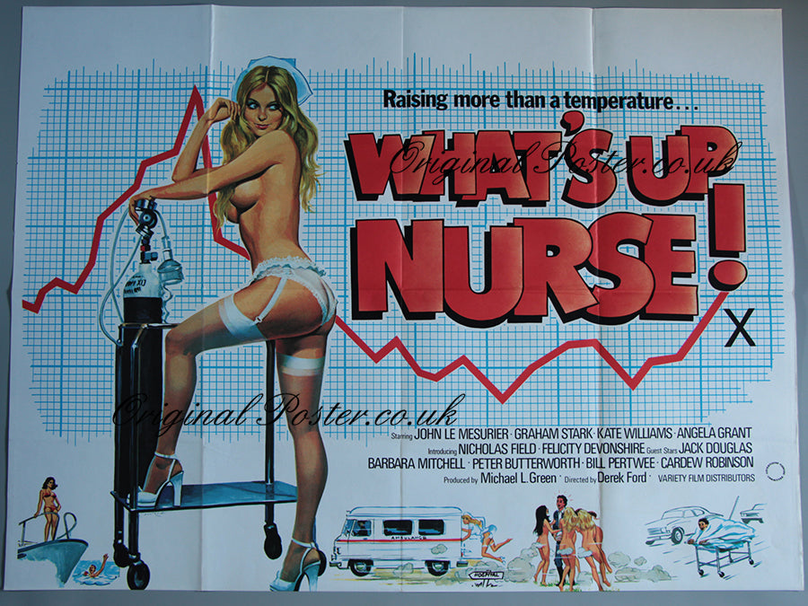 Amusing artwork by Tom Chantrell. This was a popular film at the box office and a sequel called "What's up Superdoc" soon followed. The poster is designed to catch the eye and the pretty nurse forgetting her uniform for work ensures this! Comic detail at the foot continues the theme and the large "X" certificate left cinema goers in no doubt that this would be a sex comedy based around the hospital.