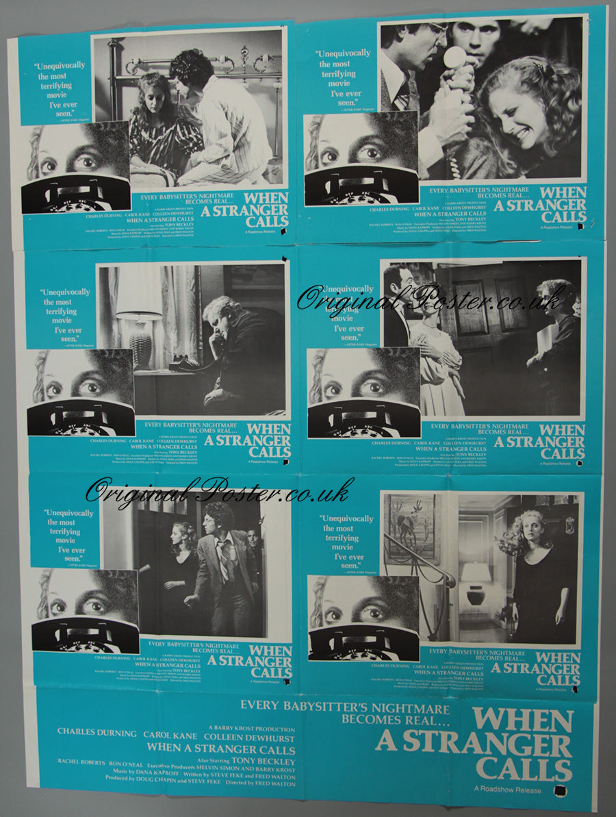 Here we have six front of house lobby cards for the 1979 horror thriller "When a Stranger Calls" direct from a cinema in New Zealand. The old fashioned telephone is pictured as the main instrument of torture for the frightened babysitter who is plagued by a stranger in a room upstairs! This Roadshow release comprises four of the cards on a poster with two separate cards. The certificate has been felted out on each of the cards.