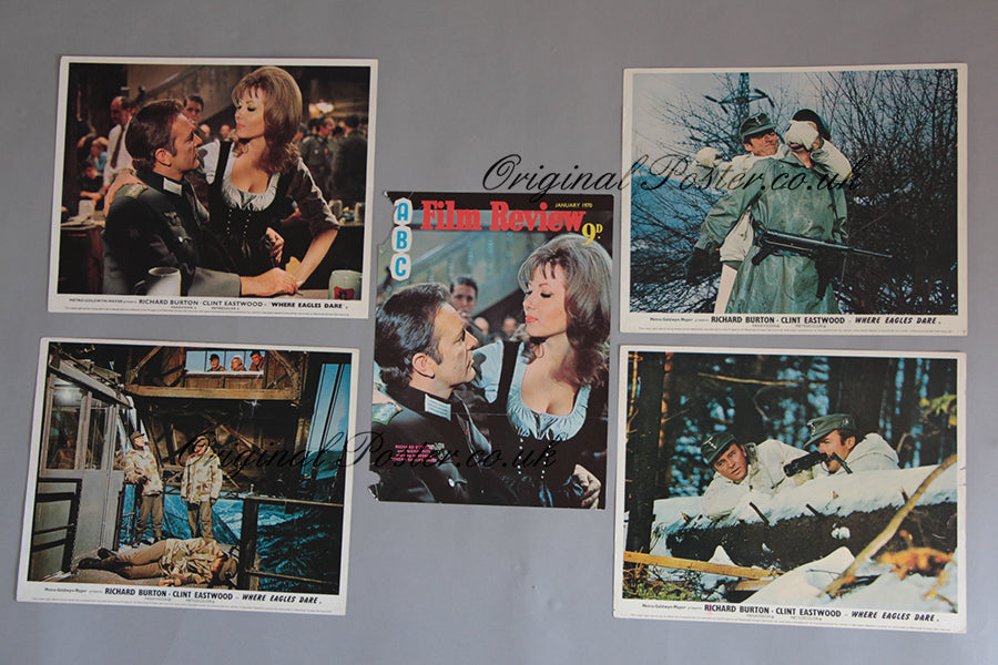 Four British cinema front of house lobby cards from 1969 with one featuring the classic Richard Burton scene with Ingrid Pitt in the Austrian alps together with an ABC Film Review front cover of the same image. The three other cards are depicting key scenes with Richard Burton and Clint Eastwood - the main stars of this popular 2nd World War film.