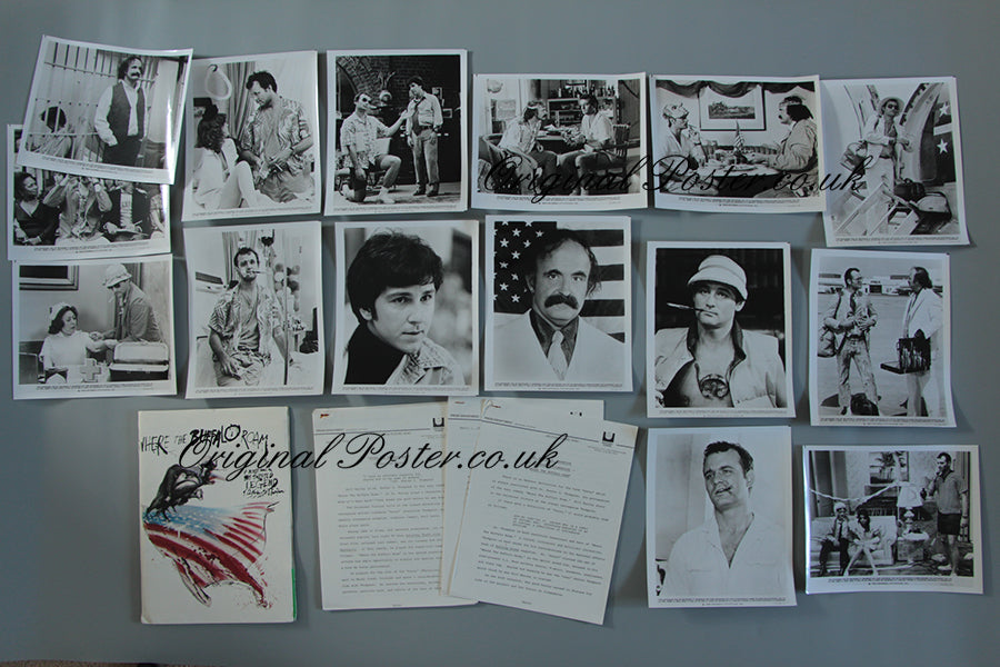 Fifteen black and white cinema stills from the 1980 movie "Where the Buffalo Roam" picturing Bill Murray in many of the photos as gonzo journalist Hunter S. Thompson. The cover that contains the press pack has artwork by Ralph Steadman and the pack also contains production notes, synopsis and press dept details.