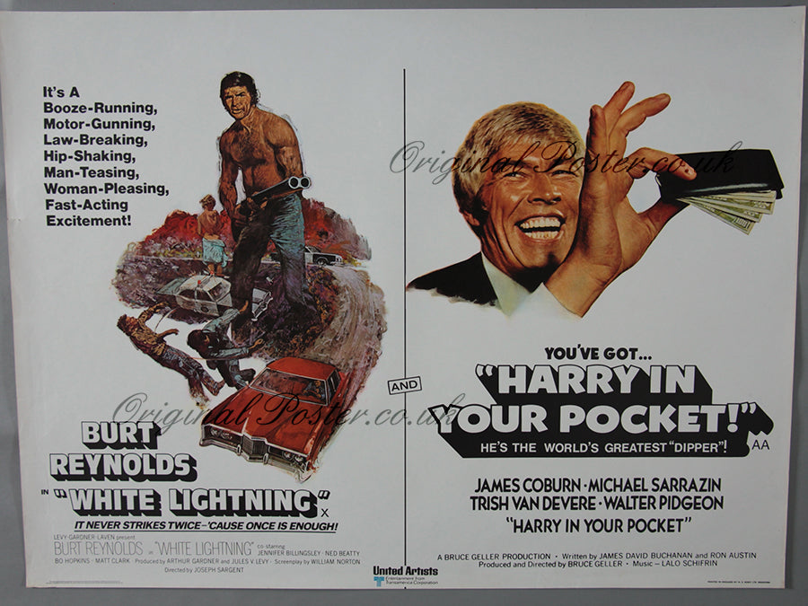 Rolled condition British Double-bill action film poster starring Burt Reynolds and James Coburn. Printed by W. E. Berry Ltd of Bradford. Great artwork of Burt Reynolds and James Coburn on this United Artists double-bill.