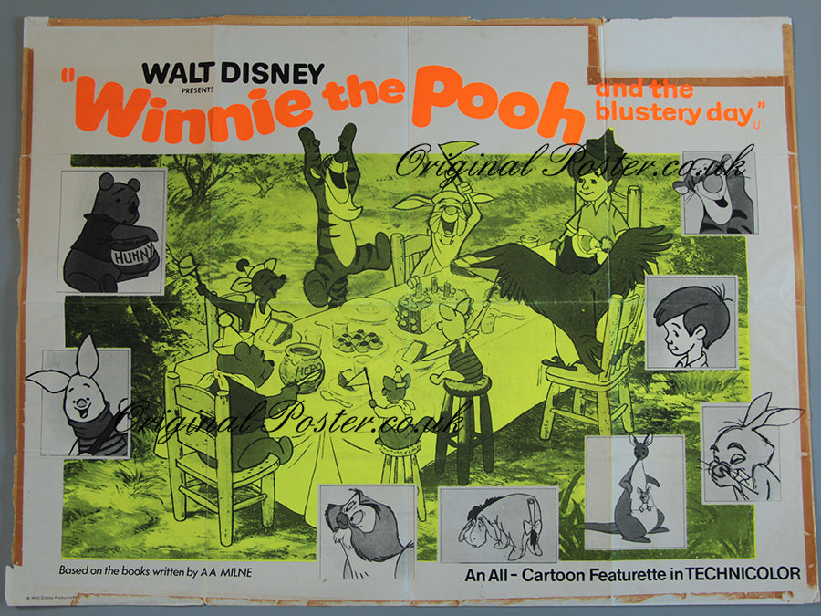 This 1968 Walt Disney British quad film poster for "Winnie the Pooh and the blustery day" pictures Winnie the Pooh with his friends around the birthday table in celebration. Great pictures of Christopher Robin, Tigger, Rabbit, Kanga, Eeyore, Piglet and all the crowd. This one is a rare survivor and has historic tape marks around the border together with a blanked section at the top right where at one time the showtimes may have been added.