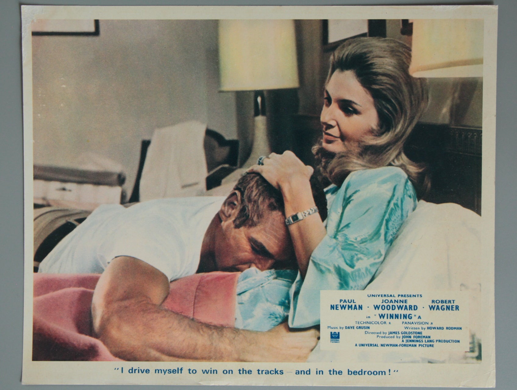 Original front of house cinema lobby card for "Winning" in full colour from the year 1969 featuring Paul Newman with Joanne Woodward in the motor racing film "Winning". The film was a real treat for Paul Newman who loved to race cars anyway in his spare time! The full colour scene pictures the married couple in bed complete with a synopsis "I drive myself to win on the tracks - and in the bedroom!". Great full colour card as issued to the cinema and with no pinholes.