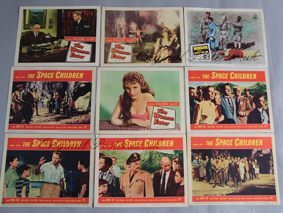 Three cards from 1959 for the British science fiction film "The Womaneater" with card no 8 featuring the voluptuous Vera Day who believe it or not is destined to be eaten by a tree because a scientist believes this to be in her best intentions in order to make him immortal. Also included is the 1957 "Monster from Green Hell" and the 1958 "The Space Children". (9 cards)