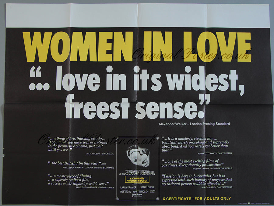 Ken Russell directs and Glenda Jackson wins an Oscar. This quad has printing by Lonsdale & Bartholomew (Nottingham) Ltd. and includes the "X" certificate plus the complete white strip at the top of the poster. Reviews are from the Daily Mail, London Evening Standard, Observer, Daily Sketch, News of the World and Daily Express