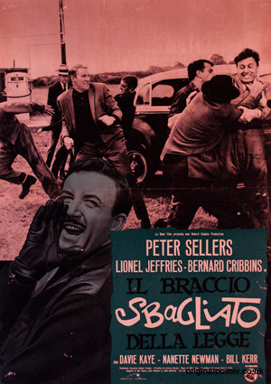 Peter Sellers is pictured on this Italian film poster for "Wrong arm of the Law" from 1962. There is a horizontal fold line and paper lift and pinholes mainly in the border with the benefit of the Italian perforations.