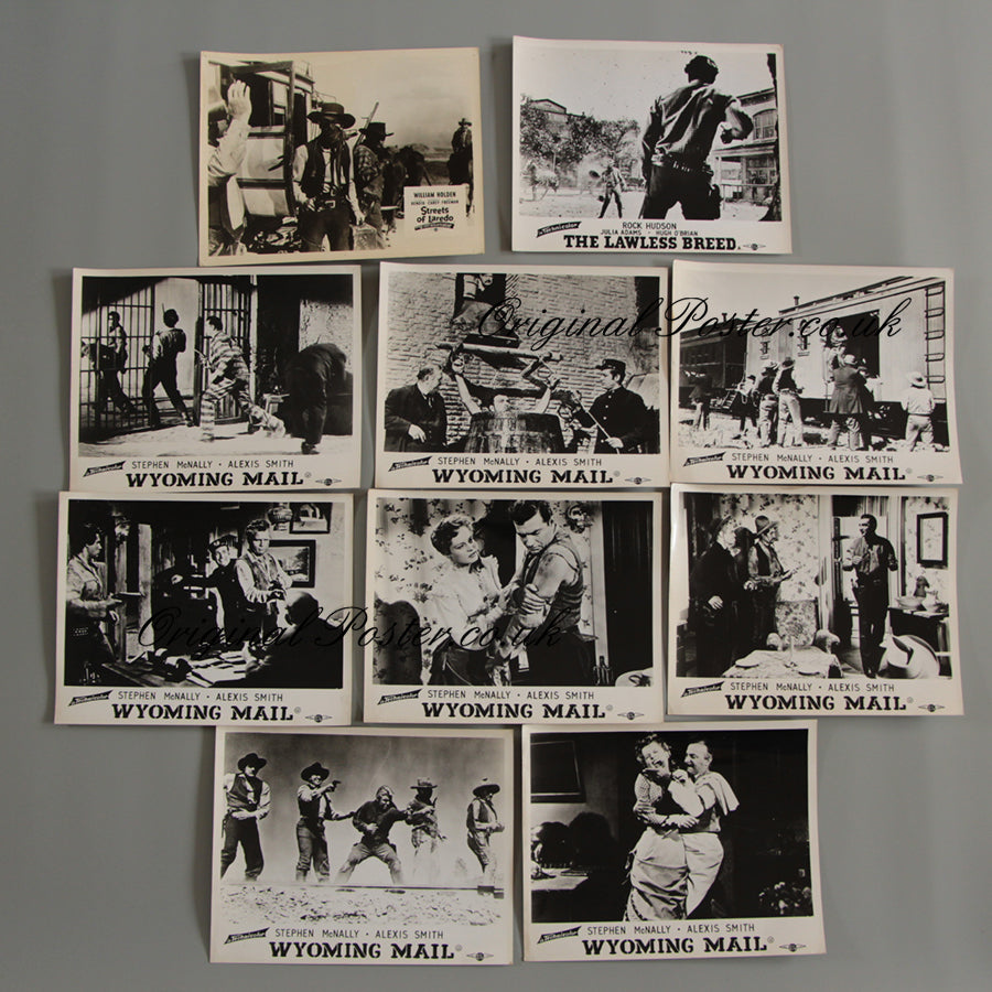"Streets of Laredo" is a remake of the King Vidor 1936 Western "The Texas Rangers" in which three outlaw friends go their different ways with two of them becoming lawmen and then pursuing the third. "Wyoming Mail" is a 1950 Western with a good supporting cast including Richard Egan. The "Lawless Breed" lobby card features the gunfight with Rock Hudson. 10 black and white lobby cards.