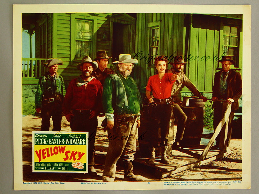 Excellent condition US lobby card no. 6 for the 1952 20th Century Fox rerelease of "Yellow Sky" starring Gregory Peck.