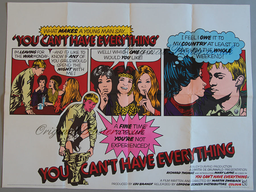 London screen distributor's logo featured on this "X" certificate film poster printed in England by Lonsdale & Bartholomew Ltd. of London. Fine full colour comic-strip art inspired by the pop-art of the time. An unusual film poster and certainly carrying one of the cheekiest and most unlikely chat up lines ever.