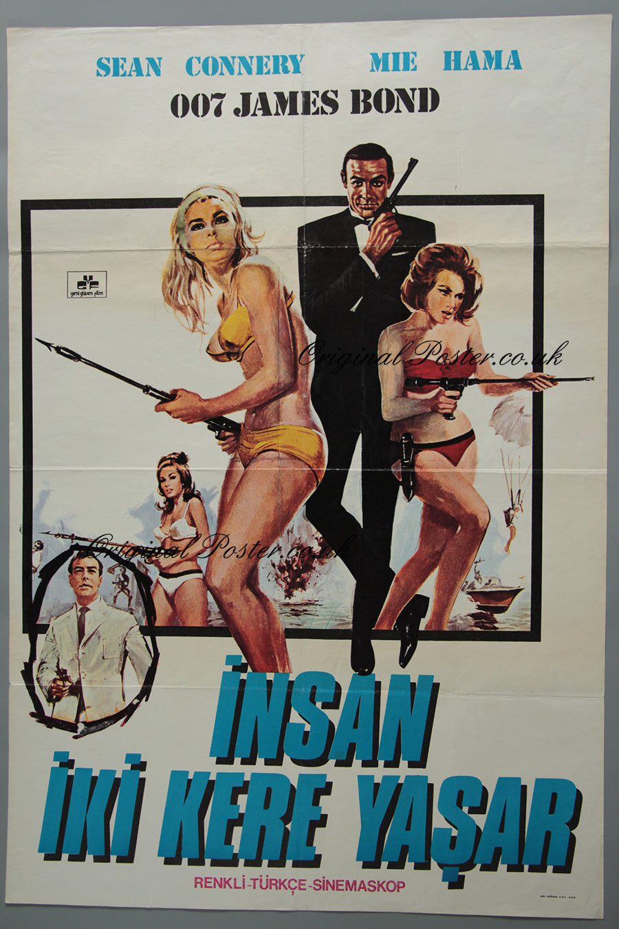 This Turkish first release cinema poster features different artwork. The Bond girls have harpoon guns at the ready and the whole action scene evokes memories of "Thunderball" (The previous Bond film.) Connery is painted as Bond in classic dinner jacket pose suggesting that the Turkish artists had Frank McCarthy's reference material. James Bond opts for his more traditional gun and surrounds himself with a bevy of bikini clad beauties equips with harpoon guns and knives.