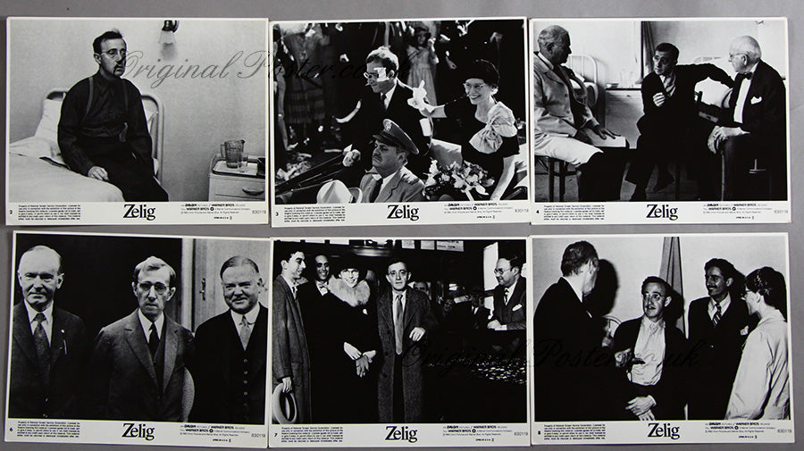 Six numbered cinema lobby cards featuring Woody Allen in "Zelig" from 1983.