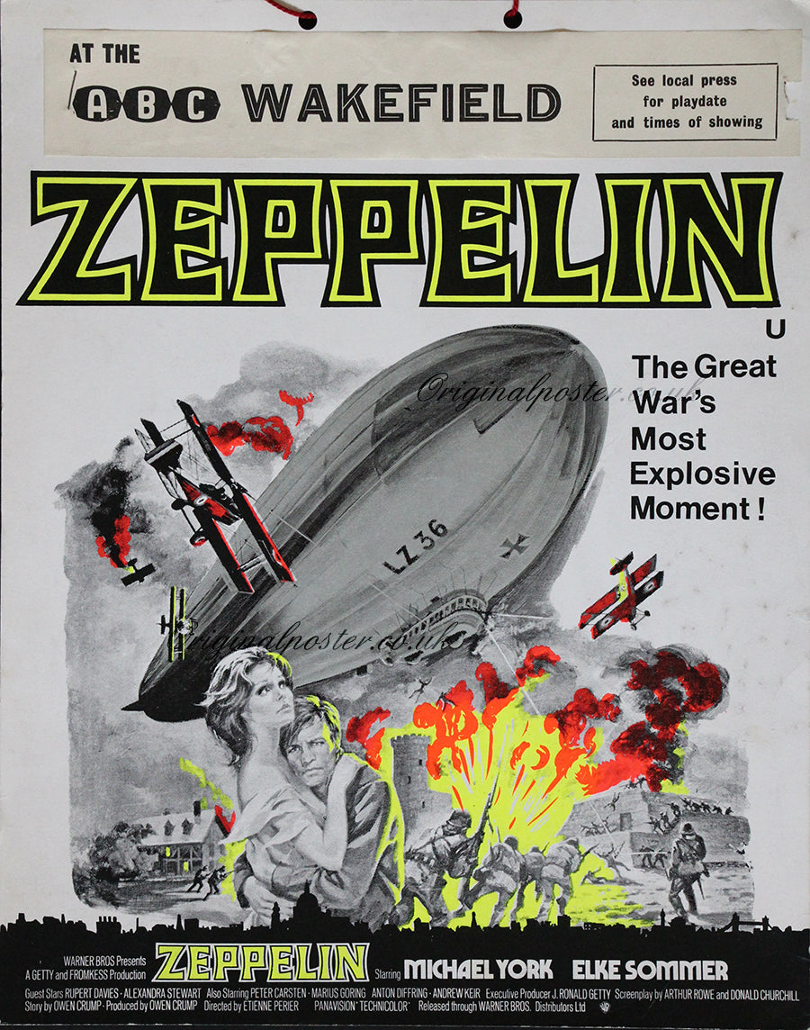 Printed on heavier card this window card still retains the original hanging thread from it's time at the ABC Wakefield cinema. The poster pictures the German zeppelin with figures falling to the floor as Michael York and Elke Sommer share an embrace. These type of cinema display materials seldom survive as they were generally designed for hanging around the local area of the cinema. Conjecture still abounds today as to the precise cause of the destruction of the German airship "The Hindenberg".