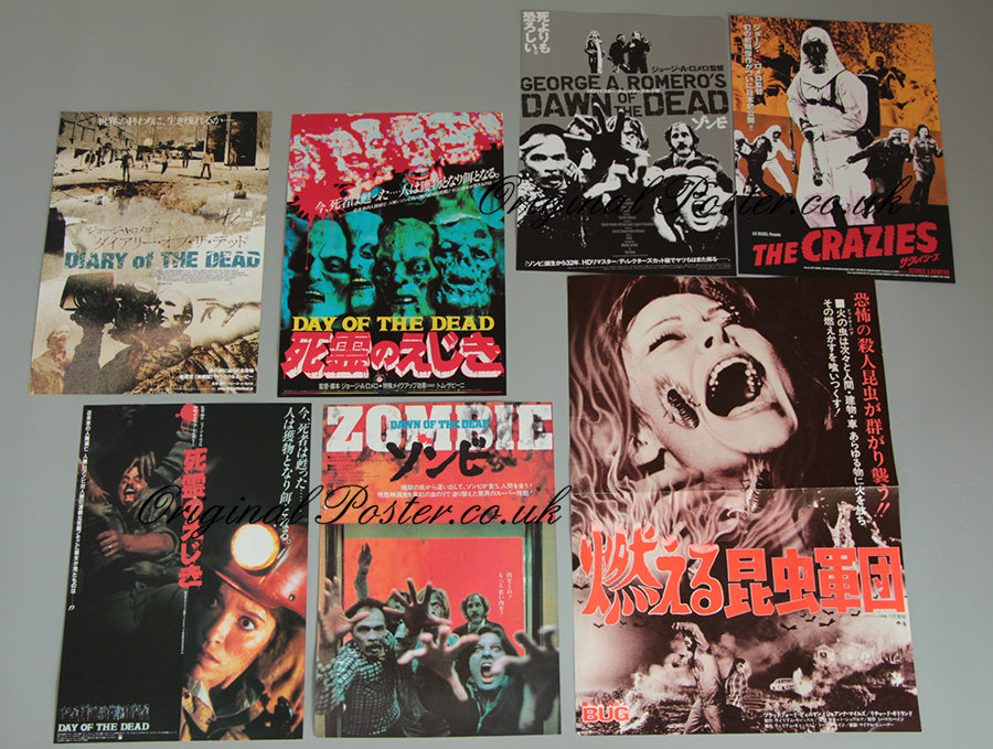 Seven Japanese small film posters for Horror films by director George Romero including "Day of the Dead"x2, "Dawn of the Dead"x2, "Diary of the Dead", "The Crazies", plus "Bug".
