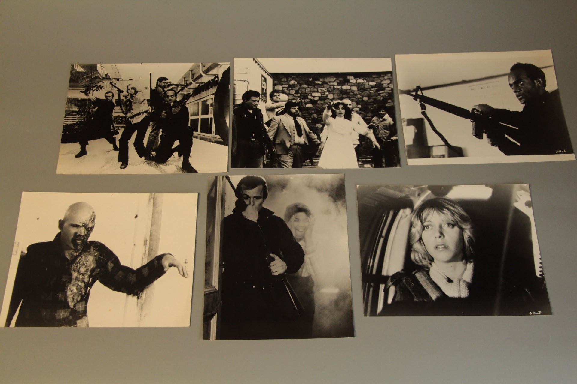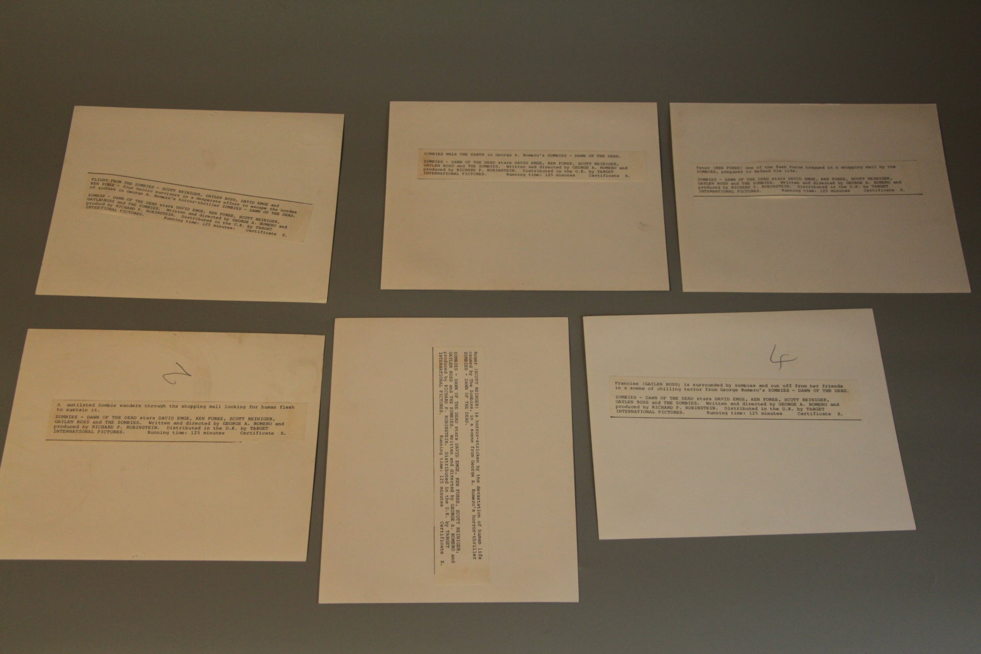 Full set of six original front of house stills from the first cinema release in 1978 for the George Romero directed classic horror film "Zombies Dawn of the Dead". Each still has a printed synopsis attached to the rear. Scenes include the zombies walking the Earth plus a mutilated zombie wandering through the shopping mall looking for human flesh to sustain it. The third card pictures Francine (Gaylen Ross) surrounded by zombies and cut off from her friends. Scott Reiniger (Roger) is pictured on the walkie talkie with Ken Foree (Peter) pictured in the shopping mall gun in hand preparing to defend his life. The final card pictures our four heroes outside the shopping mall as survivors trying to escape the hoards of zombies.