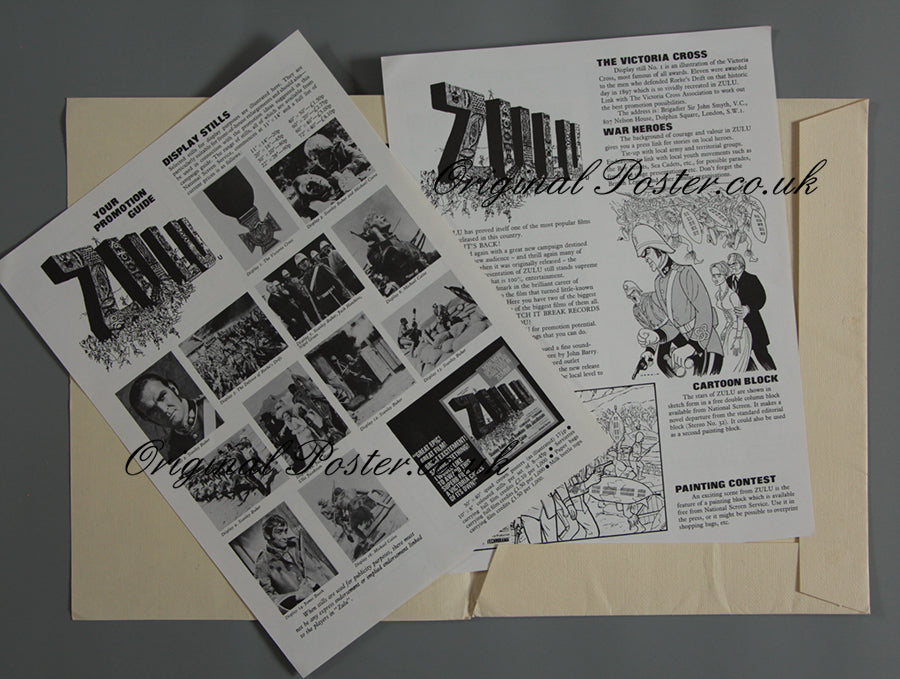 Super Paramount Pictures advertising, publicity and merchandising promotion guide folder complete with two sheets (4 pages) of details on "Zulu" picturing the quad crown posters, press ads, display stills with many photographs, promotional ideas including painting contests with painting block, cartoon blocks, puzzle blocks, editorial blocks and more for the re-release of 'Zulu' starring Michael Caine and Stanley Baker.